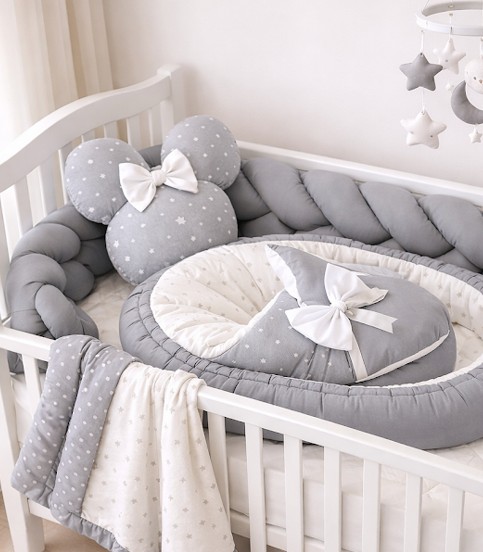 • Pletený cop mantinel (180 cm): Moderní a stylová ochrana, která zajistí, že se miminko v postýlce neuhodí o tvrdé příčky. Cop je měkoučký, drží tvar a později skvěle poslouží i ve velké posteli.