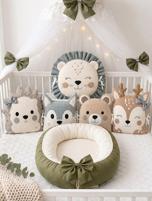 Luxusní oboustranné hnízdečko (39x80 cm): Vnitřní plocha v krémové barvě nabízí měkkou náruč pro odpočinek, zatímco vnější olivová strana s výraznou mašlí dodává celému setu šmrnc. Hnízdečko je ideální pro spánek v posteli rodičů i jako bezpečný prostor kdekoli v domě.