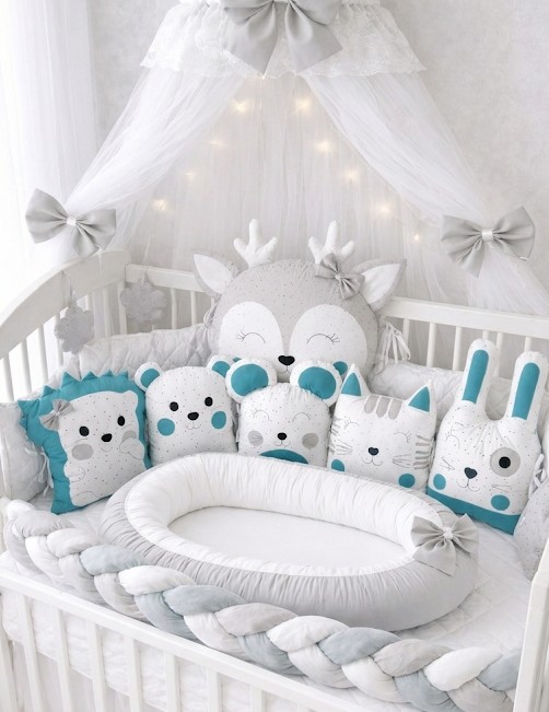 Luxusní 5dílný mantinel (180 cm): Středobodem je velký šedý srneček s bílými parůžky a mašličkou. Společnost mu dělají tyrkysový lvíček (ježek), medvídek, kočička a zajíček. Každý polštářek je bohatě vyplněn, aby spolehlivě chránil hlavičku miminka před nárazy.