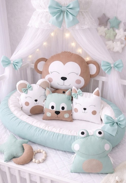 Hledáte výbavičku, která vyčnívá z davu? Naše sada v kombinaci svěží mentolové a hřejivé hnědé přinese do pokojíčku energii i klid zároveň. Tento 5dílný set mantinelů a hnízdečka s dominantní opičkou je navržen tak, aby chránil vaše miminko a dělalo mu radost od prvního dne.