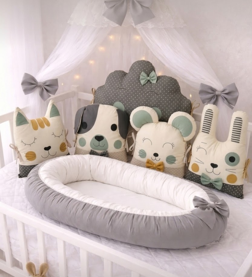 Milujete čistý design a jemné barvy? Naše sada "Spinkání v oblacích" v kombinaci elegantní šedé, šalvějové a smetanové je ideální volbou pro rodiče, kteří hledají stylovou a zároveň maximálně funkční výbavičku. Tento 5dílný set mantinelů a hnízdečka zajistí vašemu děťátku pocit bezpečí a pohodlí od prvního okamžiku.