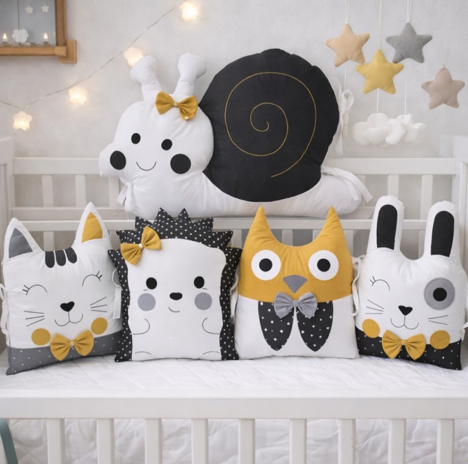 Hledáte mantinel, který je stylový, moderní a zároveň maximálně funkční? Tato 5dílná sada v odvážné kombinaci hořčicové a černé s hravými detaily mašliček a motýlků je přesně to, co vaše postýlka potřebuje. Velký šnek a čtyři originální kamarádi (kočička, ježek, sovička a králíček) vytvoří v postýlce bezpečné a inspirativní prostředí.