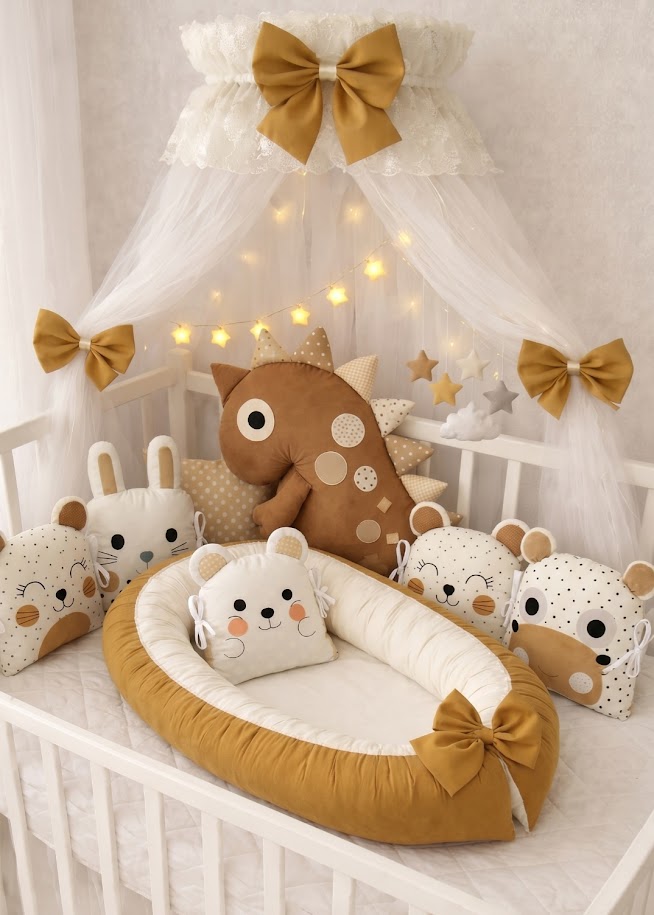 Chcete pro své děťátko něco víc než jen klasiku? Naše hořčicová sada s motivem dinosaura je symbolem moderního designu a maximálního pohodlí. Tento 5dílný set (mantinel + hnízdečko) okamžitě rozzáří každý dětský pokoj a vytvoří v něm bezpečné místo pro ty nejsladší sny.