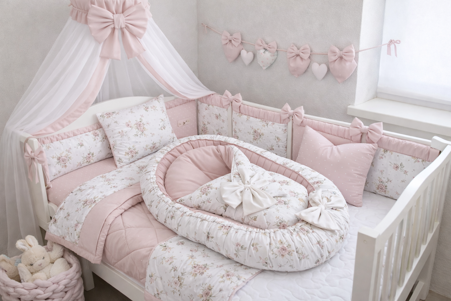 Oboustranné hnízdečko (vnitřní plocha 39 × 80 cm): Extra velké hnízdečko s ozdobnou mašlí. Díky oboustrannému designu můžete měnit vzhled postýlky – od hravých zvířátek po elegantní prošívání či puntíky.