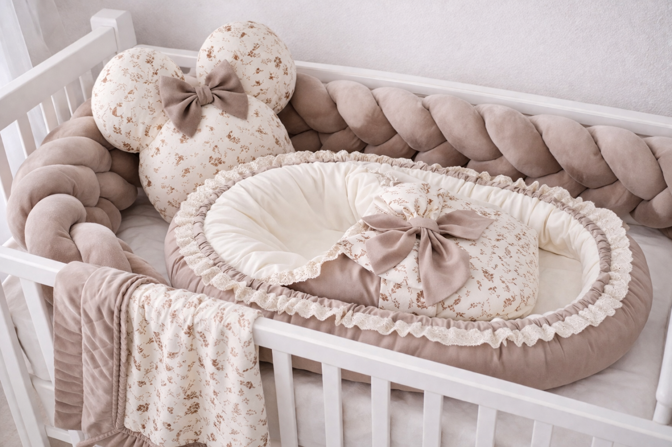 Hledáte pro své děťátko víc než jen obyčejnou výbavičku? Náš exkluzivní 4dílný set Mimime v jemných přírodních tónech kombinuje maximální komfort s pocitem absolutního bezpečí. Každý prvek je s láskou ručně šitý tak, aby miminku simuloval útulné prostředí, které znalo u maminky v bříšku.