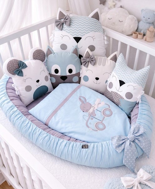 Sada „Králíček závodník“ kombinuje hravost s moderním designem. Kombinace azurově modré, elegantní šedé a trendy cik-cak (chevron) vzorů vytváří v postýlce dynamický, ale zároveň uklidňující prostor. Tato sada není jen krásnou dekorací, ale především strážcem bezpečí vašeho miminka během spánku i odpočinku.