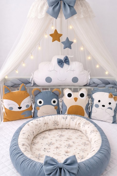 Tento exkluzivní set v moderní modro-hořčicové barevné paletě vnese do dětského pokoje energii i klid zároveň. Pečlivě sladěný design s hravými motivy zvířátek vytvoří z postýlky to nejútulnější místo pro první sny vašeho miminka.