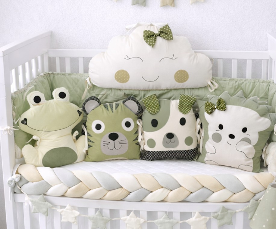 Každý mantinel je ručně šitý v České republice z kvalitní bavlny a s měkkou výplní, aby byl příjemný na dotek a vhodný pro miminka od narození.