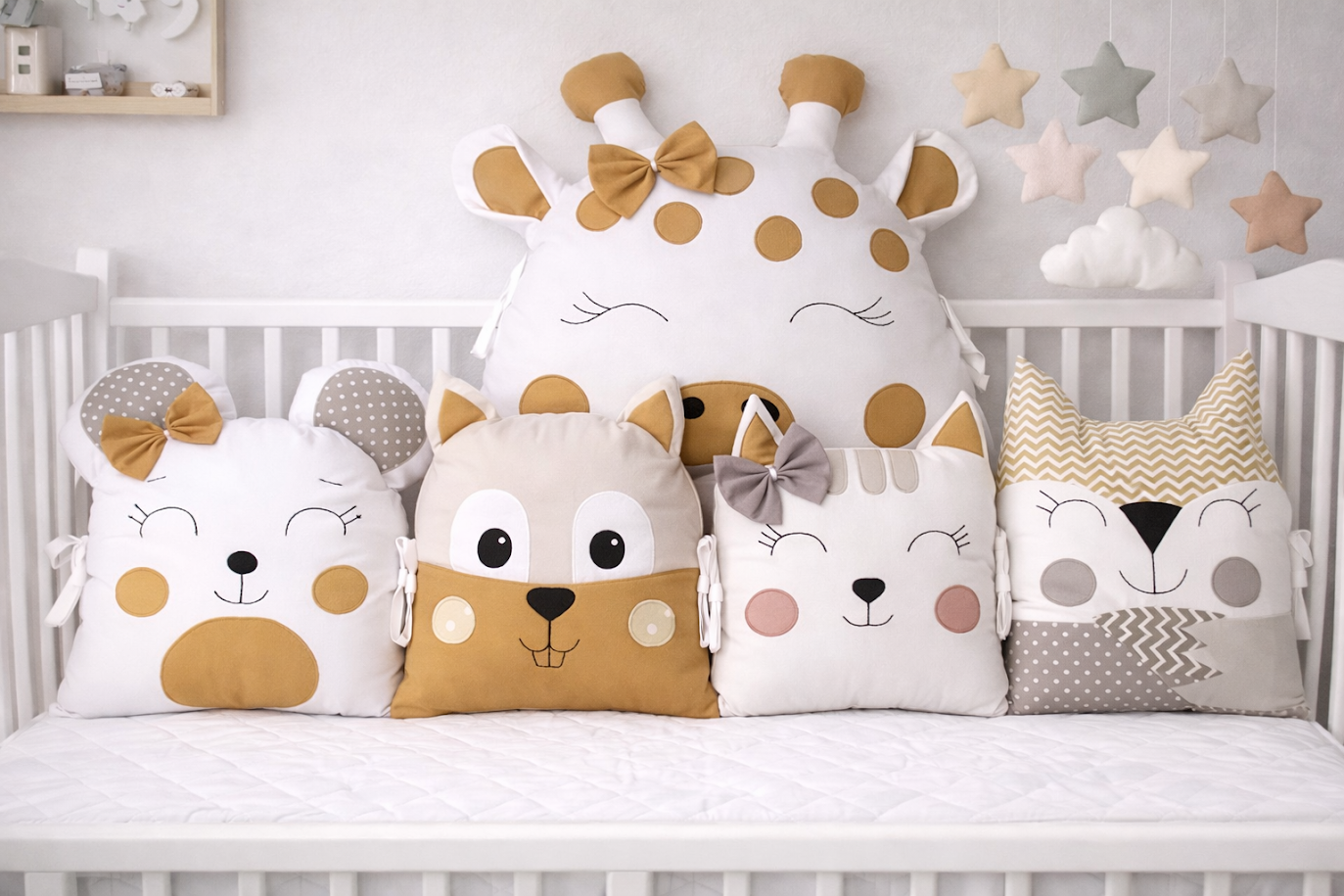Složení sady: 1x velký ústřední polštář (hlemýžď/žirafa/mráček/auto) + 4x zvířecí polštářek (liška, medvídek, mýval, kočička aj. dle varianty).