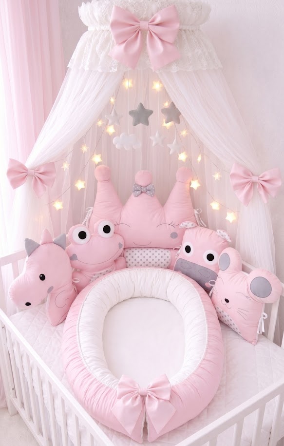 Dopřejte svému miminku pocit výjimečnosti s naší nejromantičtější sadou v barvě cukrové vaty. Kombinace 5dílného mantinelu a oboustranného hnízdečka s motivem královské koruny a jednorožce promění každodenní uspávání v kouzelný rituál plný bezpečí a něhy.