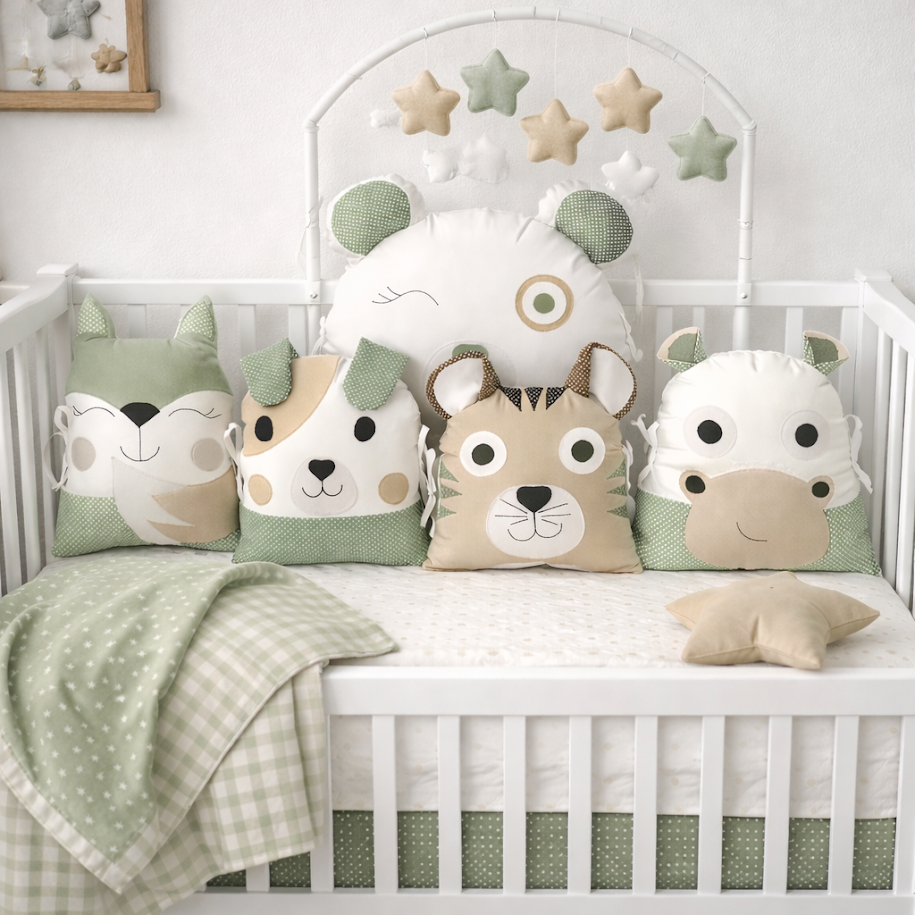Hledáte něco opravdu roztomilého? Tato sada s velkým mrkajícím medvídkem v čele postýlky okamžitě zútulní každý pokojíček. Doprovází ho stylová parta: liška, pejsek, tygr a hrošík. Vše v jemných tónech šalvějové zelené a pískově béžové.