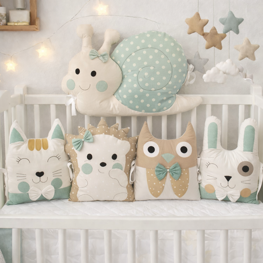 Proměňte postýlku v pohádkový svět: 5dílný polštářkový mantinel "Šneček a lesní parta"