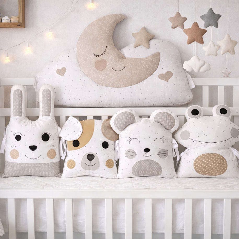 Proměňte postýlku svého děťátka v kousek noční oblohy, kde se spinká jako na obláčku. Tento 5dílný set mantinelu v neutrálních přírodních barvách kombinuje bezpečí s nadčasovou elegancí. Velký polštář ve tvaru spícího měsíčku na obláčku doprovázejí čtyři roztomilí kamarádi (králíček, pejsek, myška a žabka), kteří budou věrnými strážci klidných nocí.