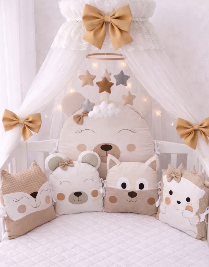Kombinace jemné krémové, pískové a medově zlaté barvy přináší do dětského pokojíčku klid a harmonii. Zvířátka s roztomilými detaily, jako jsou mašličky a ouška, se stanou prvními věrnými společníky vašeho děťátka.