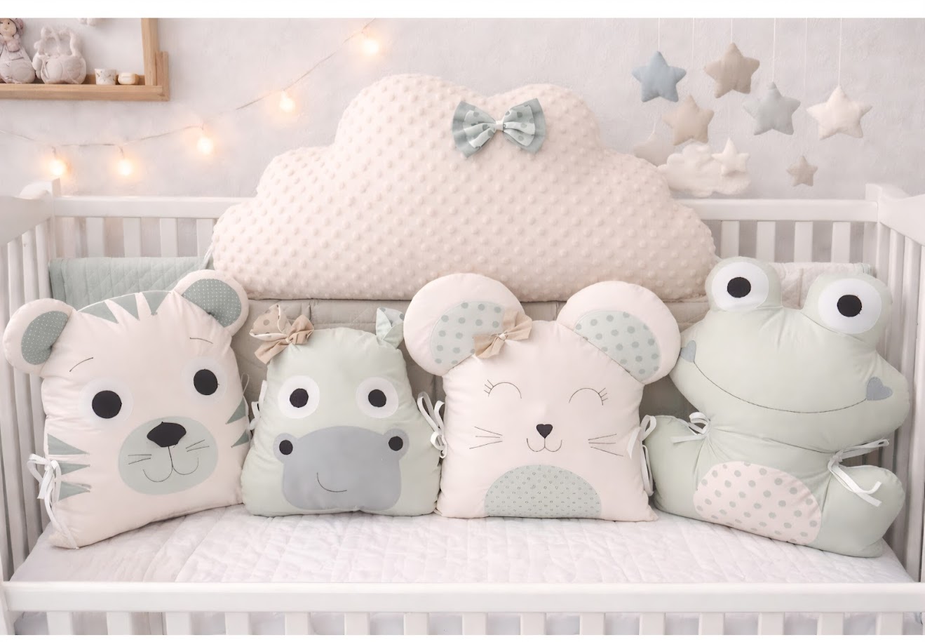 Tato sada v harmonické kombinaci mentolové, šedé a krémové barvy promění každou postýlku v designový kousek. Dominantou sady je extra velký mráček z hebkého materiálu Minky, který doplňují čtyři roztomilí kamarádi. Tento mantinel není jen na ozdobu – chrání hlavičku děťátka před nárazy do šprušlí a díky své výšce dodává pocit bezpečí a útulnosti.
