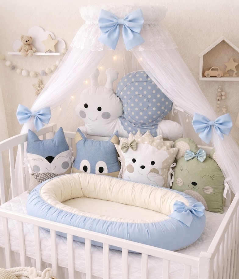 Představujeme vám naši nejoblíbenější sadu v jemných modrých tónech. Tento 5dílný mantinel a oboustranné hnízdečko není jen krásnou dekorací, ale především ochranným přístavem, ve kterém bude vaše miminko spokojeně usínat od prvního dne.