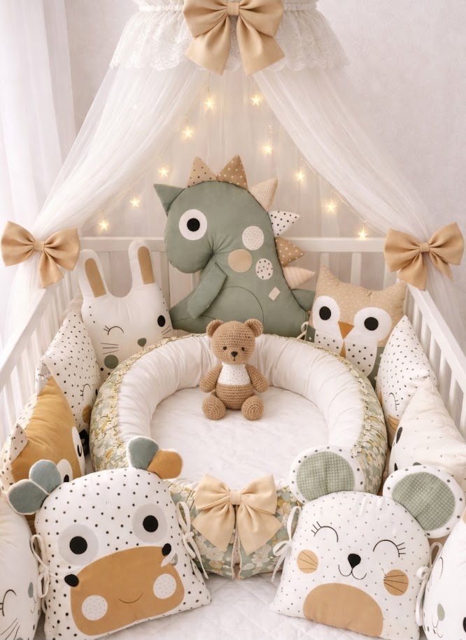 Hledáte výbavičku, která je stejně hravá jako bezpečná? Naše sada v šalvějově zelených a hořčicových tónech přenese vaše děťátko do světa fantazie. Tento 5dílný set mantinelů a hnízdečka s motivem dinosaura, sovičky a dalších lesních přátel je navržen tak, aby poskytoval maximální komfort od prvního dne života.