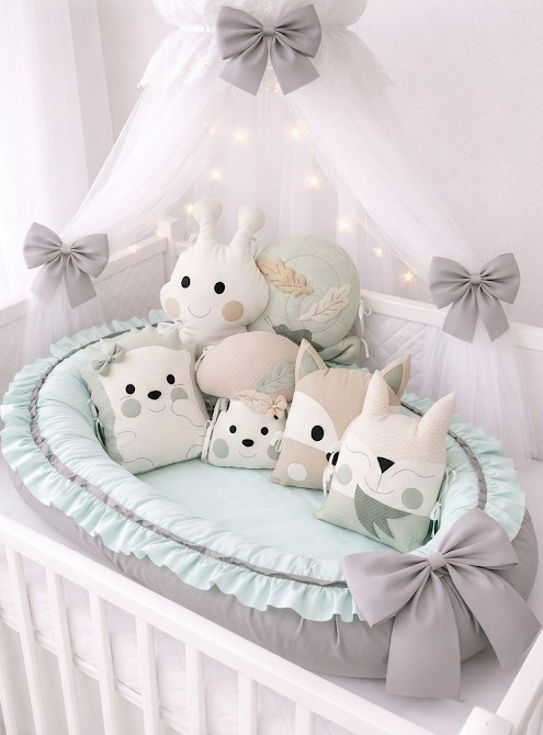 Hledáte něco jedinečného, co spojuje eleganci s hravostí? Naše sada "Lesní vánek" v kombinaci mentolové, šedé a přírodní béžové přinese do dětského pokoje harmonii a styl. Tento set vyniká precizním zpracováním, luxusními volánky a roztomilými detaily, které si zamilujete na první pohled.