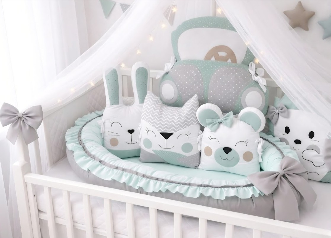 1x XXL Oboustranné hnízdečko s volánkem: S vnitřní plochou 39x80 cm poskytuje maximální komfort. Okraj zdobí stylový mentolový volánek a hnízdečko je zakončeno velkou šedou mašlí. Je oboustranné, takže můžete střídat šedou a mentolovou stranu podle nálady.
