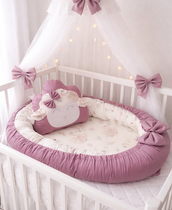 Hledáte barvu, která vynikne a přinese do postýlky nádech luxusu? Naše oboustranné hnízdečko v barvě Heather (vřesová) je ideální volbou. Sytější fialkový odstín v kombinaci s něžným květinovým vzorem vytváří stylový a útulný pelíšek. Set doplňuje náš originální polštářek ve tvaru ovečky, který si miminko zamiluje pro jeho měkkost a roztomilý vzhled.