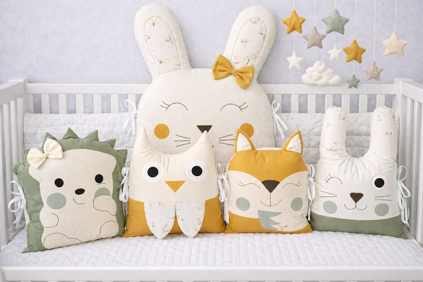 Sada obsahuje: 6 samostatných polštářků (zvířátka a dekorativní čtverce).