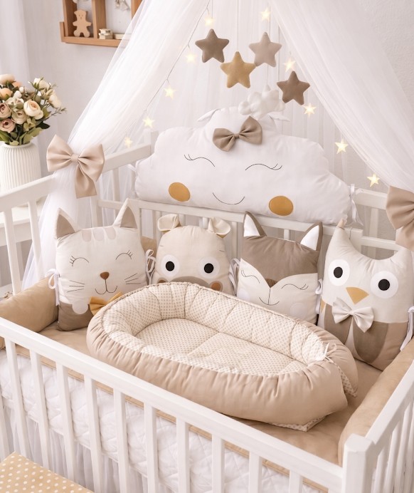 Dopřejte svému miminku pocit maximálního bezpečí s naším prémiovým setem „Zvířátka v oblacích“. Tento set v jemných pískových a krémových tónech je navržen tak, aby uklidňoval smysly děťátka a zároveň chránil před nárazy do tvrdých bočnic postýlky.