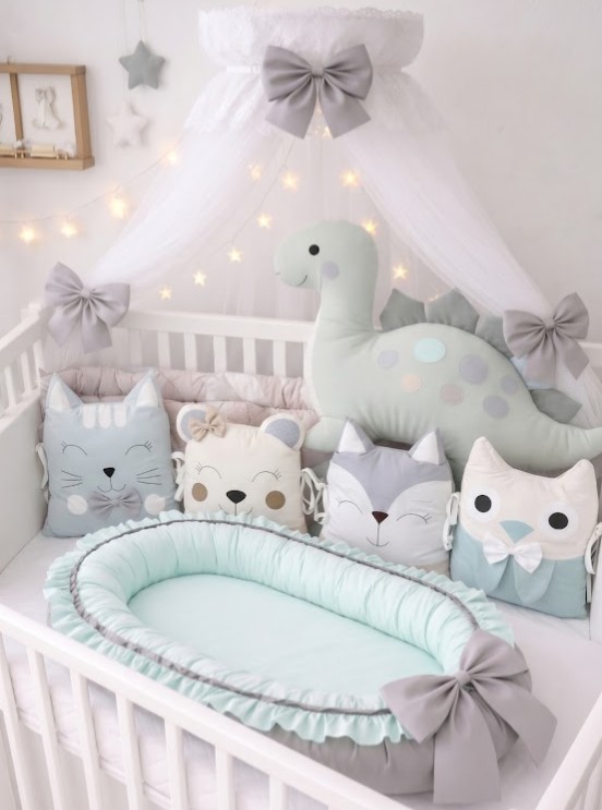 Hlavní hvězdou je velký plyšový dinosaurus, který hlídá spánek vašeho miminka. Spolu s kočičkou, medvídkem, liškou a sovičkou tvoří měkkou bariéru, díky které bude hlavička vašeho děťátka vždy v bezpečí před nárazy do šprušlí.