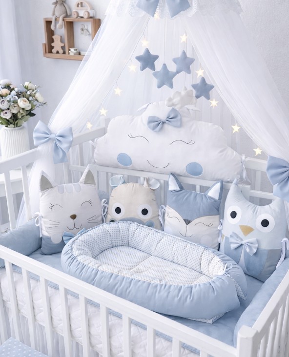 Setu dominuje ikonický velký polštář ve tvaru obláčku, který tvoří měkké a bezpečné čelo postýlky. Společně s kočičkou, medvídkem, liškou a sovičkou tvoří hravou partu, která chrání vaše děťátko před tvrdými šprušlemi postýlky.