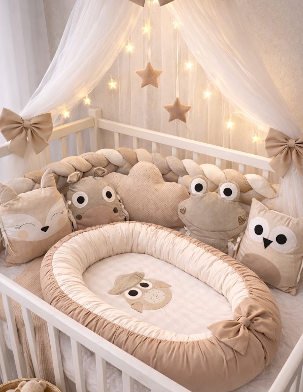 Hledáte výbavičku, která do pokojíčku vnese harmonii a klid? Náš set „Přírodní přátelé“ v barvách písku, kávy a smetany je ideální volbou. Tento neutrální design je nadčasový, působí luxusně a hodí se pro chlapečky i holčičky.