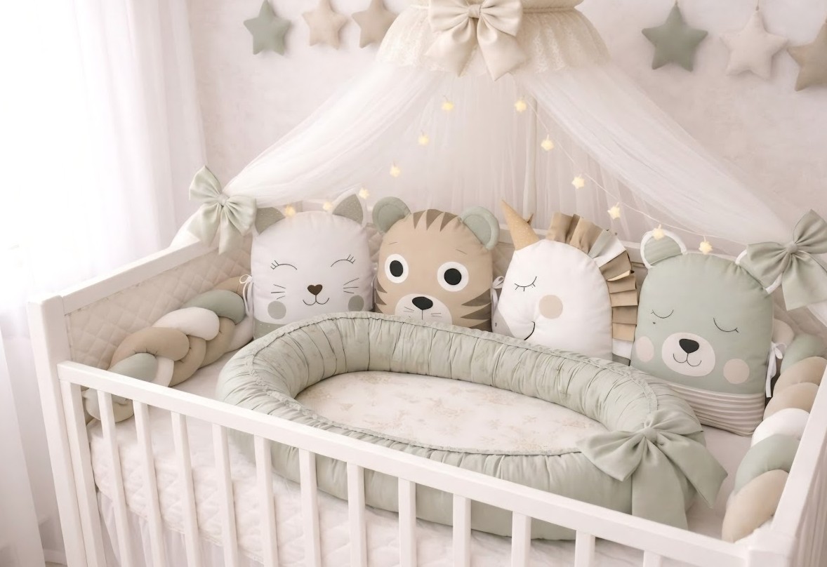 Náš prémiový set v barvě Sage Green (šalvějová) v kombinaci s krémovou a béžovou je vrcholem elegance pro moderní dětský pokojíček. Tento set není jen o estetice – je navržen tak, aby poskytoval maximální komfort a ochranu vašemu miminku od prvního dne. Roztomilá zvířátka v čele s magickým jednorožcem se stanou prvními kamarády vašeho děťátka.