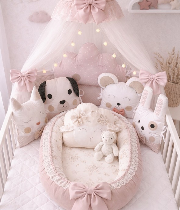 Náš prémiový set v barvě starorůžové (dusty pink) je navržen pro maminky, které milují detail. Kombinace roztomilých zvířecích obličejů, jemných puntíků a poctivé krajky vytváří z dětské postýlky snové království.