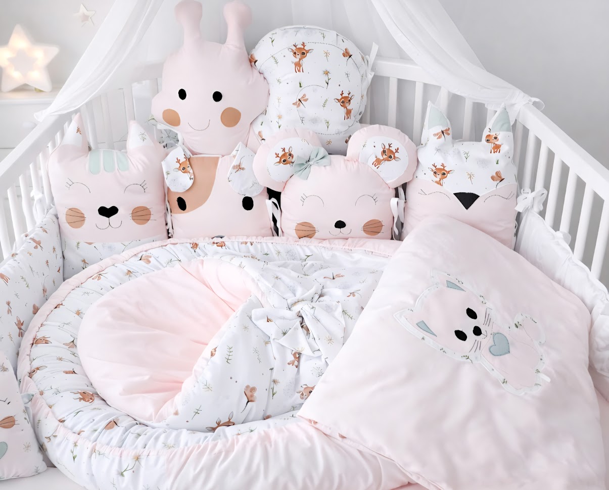 • Mantinel do postýlky zvířátka (180 cm): Měkký polštářkový mantinel tvořený veselými zvířátky, která chrání hlavičku před tvrdými příčkami postýlky. Zvířátka se stanou prvními kamarády vašeho děťátka a později poslouží jako stylové polštářky.