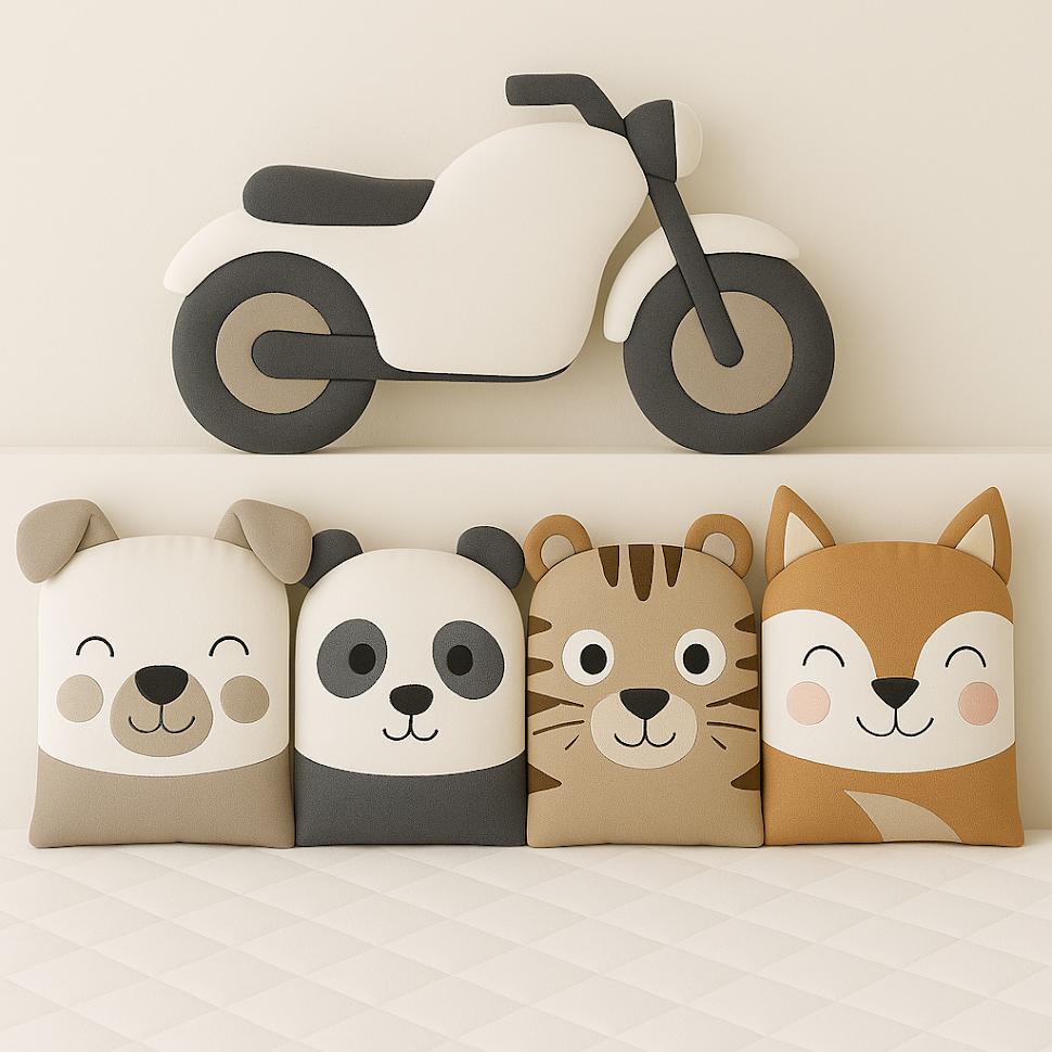 Dominantou celé sady je originální měkoučká motorka – výrazný, ale stále jemný designový prvek, který okamžitě zaujme a dodává postýlce výjimečný charakter. Pod ní stojí čtyři krásně sladěné mantinelové díly, které dohromady tvoří útulný a bezpečný prostor pro miminko.