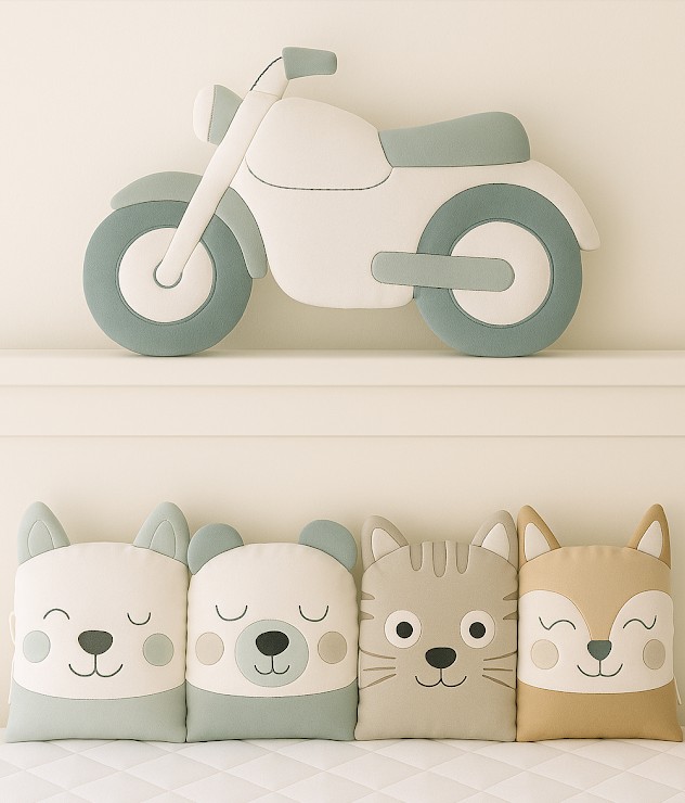 Dominantou celé sady je designová motorka, která dodává postýlce originální a hravý prvek. Pod ní jsou umístěny čtyři měkoučké polštářkové díly tvořící mantinel – každý z nich ručně ušitý, detailně propracovaný a dokonale sladěný do jednoho elegantního celku.