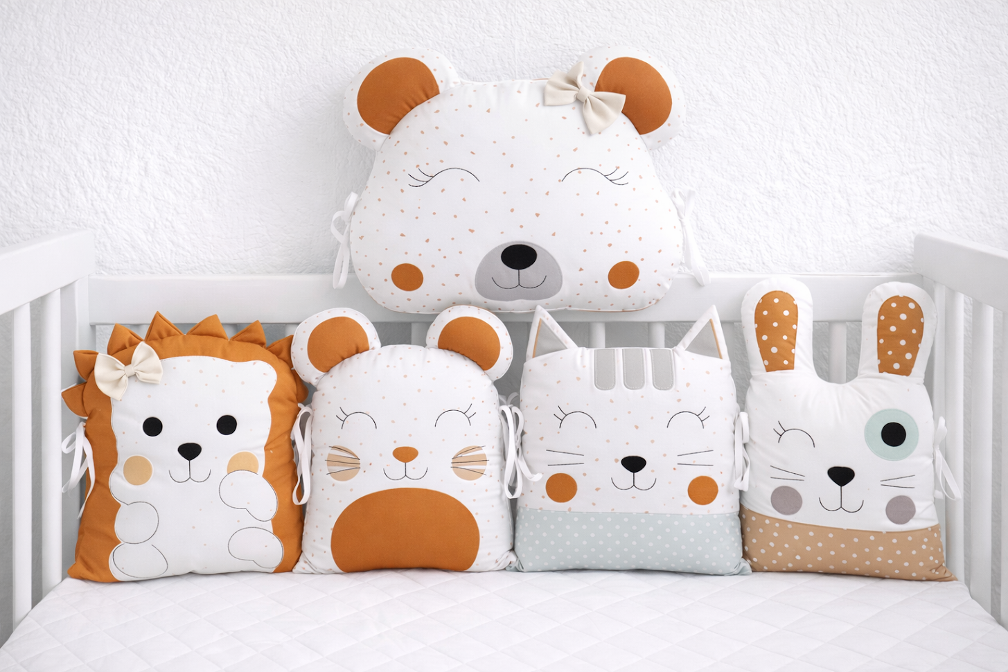 Tento 5dílný set mantinelů v moderní hořčicové a přírodní bílé barvě je dokonalým doplňkem do každé dětské postýlky. S celkovou délkou 180 cm poskytuje spolehlivou ochranu před tvrdými příčkami, zatímco jeho hravý design s jemnými obličeji a detaily (jako jsou mašličky a tečky) okamžitě zútulní interiér.