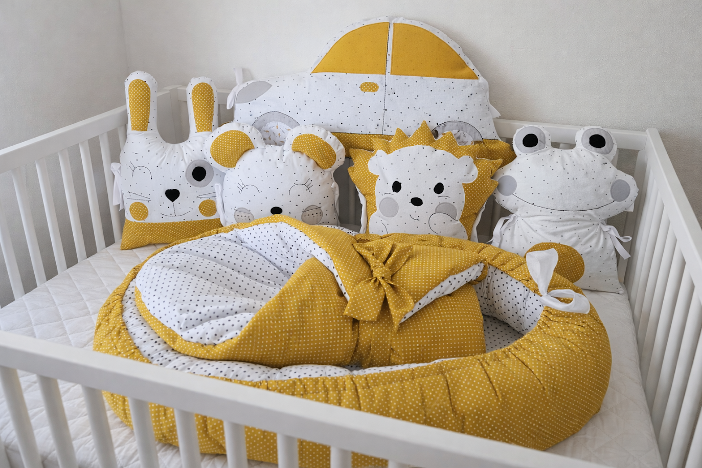 Vneste do dětského pokojíčku hřejivou atmosféru s naší kolekcí „Hořčicové sluníčko“. Tato barva je symbolem optimismu a radosti, což je přesně to, co každé miminko potřebuje. Set kombinuje moderní sytě žlutou s jemným šedým detailem a hravými bílými puntíky. Od prvního uložení do měkké zavinovačky až po bezpečné spaní v ohrádce z mantinelů – tento set bude vaše děťátko provázet každým dnem i nocí.